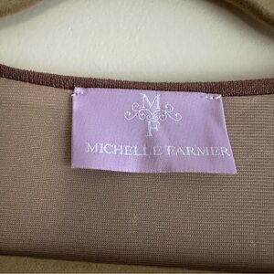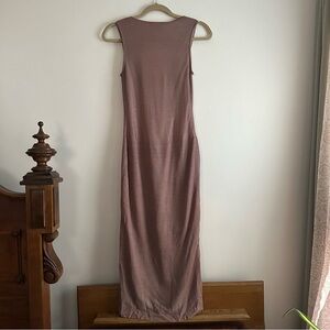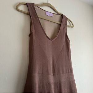 Rose gold colored midi sleeveless dress made of 100% viscose. Very slight sheen. Lined. Form-fitting with a flattering knit design. Deep V-neck. No notable flaws!