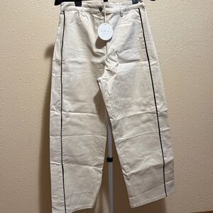 Elevate your style with these cream pants featuring a sleek black stripe. Perfect for any occasion. This would pair perfectly with a black top/sweater/tee or blazer. I removed the from their shipping plastic for the photos. They do have stretch. The measurements are relaxed.