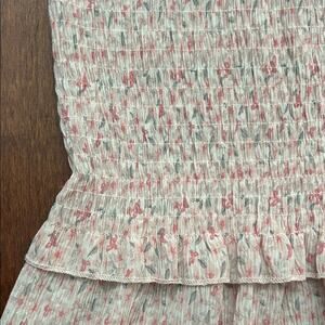 Adjustable spaghetti strap floral smocked all around midi dress with ruffle detailing.