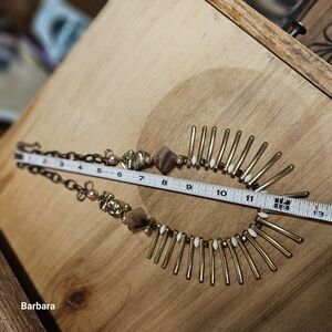 Bold statement piece. Features bronze-like spikes and with various forms and styles of beads. Perfect for adding flair to any outfit. Extension chain for length.