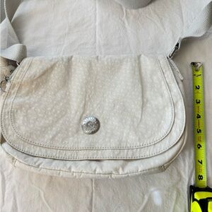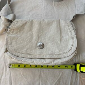 Elegant cream crossbody bag by Kipling. Features a cute charm and adjustable strap.