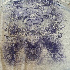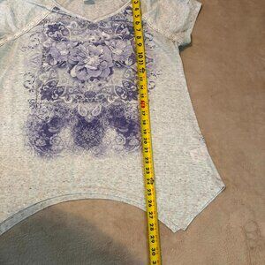 Faded Glory women’s short sleeve V-neck top with a soft heathered light gray base and purple floral graphic print. Features delicate lace trim along the neckline seams and a flattering high-low hem that drapes nicely in the back.
