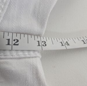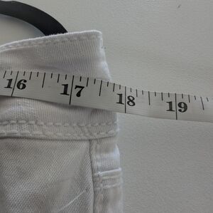 Stylish white jeans with unique paint splatter design. Perfect for a trendy look. Waist measures 17 inches laying flat. Inseam measures 27 inches. Rise measures 13 inches.