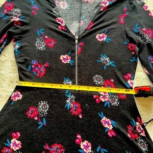 This stylish dress from Express features a flattering fit and flare silhouette with a V-neckline and 3/4 sleeves, perfect for both casual and work settings. The dress comes in a sophisticated blue and black color palette, offering a versatile and chic look for any occasion.