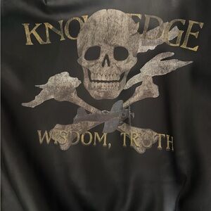 Black leather jacket featuring a unique card-themed patch. Signature style with artistic flair.
