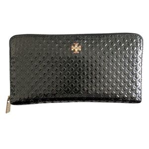 The wallet is part of the Tory Burch Marion collection, known for its embossed leather and classic design.