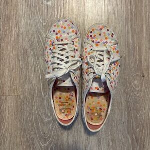 Colorful polka dot sneakers by Kate Spade. Features vibrant dots on a white base. Perfect for casual wear. Some wear but in good condition. Size 8.