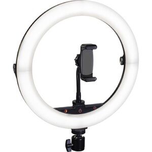 The Bendie-Brite Folding USB Bi-Color LED Ring Light from Raya measures 10" in diameter and produces soft light useful for illuminating your live show, selfie, video conference, or webcam chat. It folds in half to a 5" semi-circle for compact storage or transport. The ring light minimizes shadows, produces an even quality of light, and creates circular catchlights in your subject's eyes.