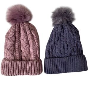 Stylish knit beanie set in a pink and classic gray, these hats are perfect for any winter outing. Soft and comfortable, they are a must-have accessory for the cold weather!