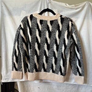 Cozy and very warm cable knit sweater in black and cream. One size. Worn but in good condition.