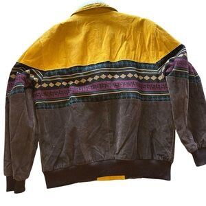 Step up your fashion game with this retro bomber jacket. Featuring a bold yellow and brown design, it's perfect for a stylish, vintage-inspired look.