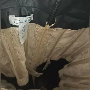 Oscar de la Renta Black Silk Taffeta One shoulder Dress-Size 10. This one shoulder (left) Oscar evening/cocktail dress is made of a black thick silk taffeta, is fitted to the waist with an interior built in corset that has a belted part with hook and eye closure and a zip for a nice snug fit, the skirt then has a structured foldover/ruched/draped detail to it throughout and a 14" back zip making it very easy to put on. The Shoulder and neckline has a 5" silver/gold striped silk trim/drape that snaps in place in the back inside along with hook and eye.