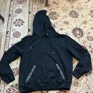 Sleek black hoodie with drawstrings. Features branded pocket details. Perfect for casual style.