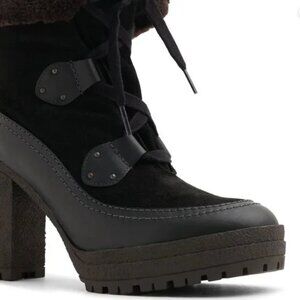 Upper can be folded over or worn up. Suede and Leather are black, shearling inner fur is a dark brown.