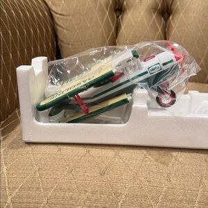 Hess toy truck with airplane. Box has been opened to remove batteries for storage and check truck currently works. Box has some damage noted in pictures. Hess truck and airplane discolored from being in box, noted in pictures. Batteries not included.