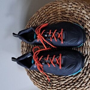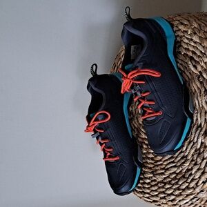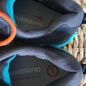 Trending cycling brand Shimano unisex performance mountain biking/cycling/activewear shoes in black uppers with teal accents. Pre-owned and in very gently used condition. Please see pictures. No clips.