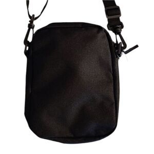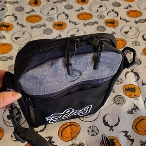 Black & heather grey, with white "LRG" logo embroidery. Adjustable & removeable crossbody strap. Front zipper compartment, has a rubber zip pull tag, with "unity in diversity" on it. Double zip pulls, that open on the top, to the main compartment, with 1 inner pocket. Nylon canvas, easy to wipe clean.