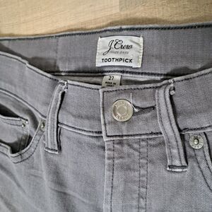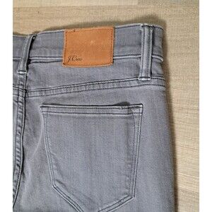 J.Crew Women's Toothpick Jeans are a gray, mid-rise, skinny style made of a cotton, polyester, and elastane blend. They feature a 5-pocket design, zip/button closure, and leather logo accent. The jeans have a 28-inch inseam and a light fabric wash. They are machine washable and have easy care, comfort, stretch, and pockets features. The Toothpick model is suitable for all seasons and has a solid pattern.