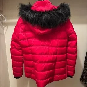 Bright red puffer coat with cozy faux fur trim. Ideal for cold weather. Stylish and warm.