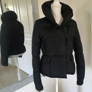 Elegant black puffer by Denim & Supply Ralph Lauren features a high, stand-up collar, a buttoned front, and a cinched waist design, fitted silhouette. Perfect for warmth and style. In a good used condition no visible flaws pet smoke free