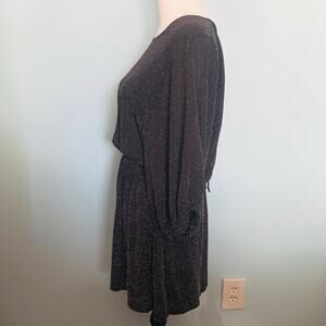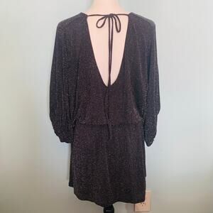 A sparkling dress that is perfect for a party, evening out or other special occasion! Black with metallic sparkles, this dress features bracelet blouson sleeves with elasticized cuffs, elasticized waist and shirred miniskirt. It also has some drama with a deep V back and a tie closure. In excellent condition