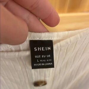 Stylish SHEIN romper. White top with button accents. Navy shorts with removable belt.