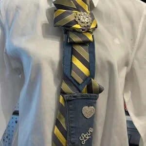 Elevate your style with this elegant striped tie featuring a striking yellow and gray pattern. The tie is adorned with a sparkling brooch for a touch of sophistication. Perfect for formal occasions or adding flair to your everyday look.