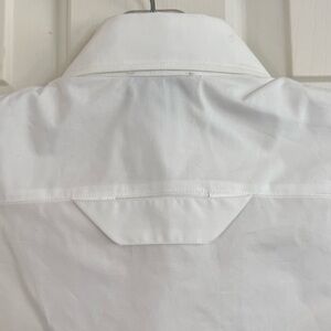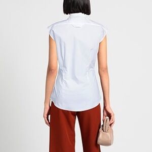 Italian made, luxury Just Cavalli, 100% cotton, crisp white, button-down collar, sleeveless, fitted, branded buttons, insert embroidered lace across yoke.