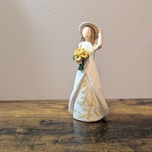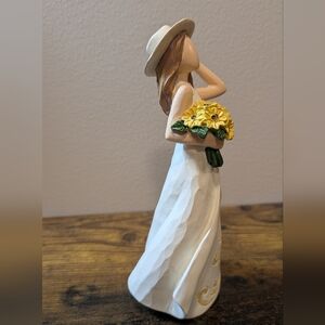 Sweet feminine figurine holding a bouquet of sunflowers. Intricate golden detailing on a white/cream dress.