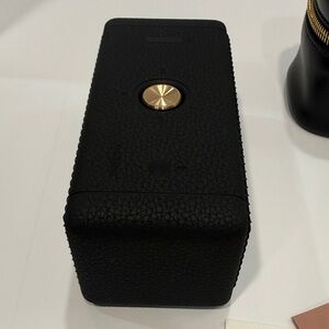 Miu Miu compact Marshall Eberton speaker in black with gold accents. Comes with a sleek Miu Miu leather case.