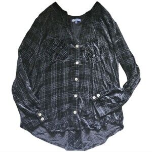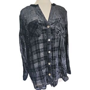 Democracy Black Textured Button Front Shirt. Size Large. Semi sheer. Stylish black shirt with a unique texture and plaid pattern. Lightly used and in great condition. Measurements in photos.