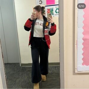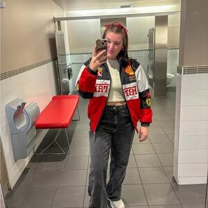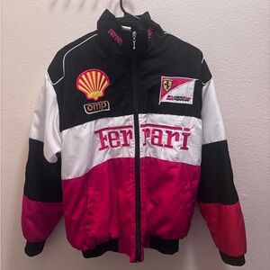Sleek black Ferrari jacket. Features a distinctive yellow tag with iconic logo.