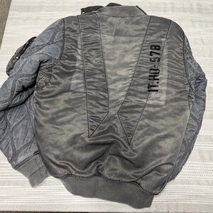Stylish gray bomber jacket by Diesel. Features quilted sleeves and a zip-up front. Perfect for casual wear.