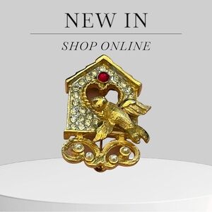 Charming birdhouse design. Gold finish with red and white accents. Perfect for any occasion.