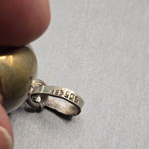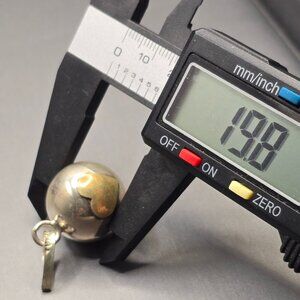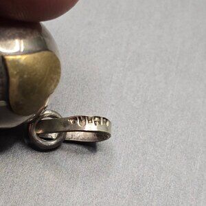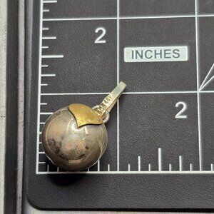 Vintage sterling silver bell pendant charm with gold-tone (brass) heart accents. Round design measures approx. 19.8mm (1.25") and weighs 12.28g. Stamped 925 and marked Mexico. Produces a delicate tinkling sound when moved. A romantic, whimsical piece perfect for jewelry customization, gifting, or collecting. Excellent vintage condition with natural patina.