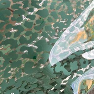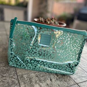 Tender Love + Carry Travel Bag. Zipper closure. Water resistant. Green leop print throughout. Translucent. Dimensions: 20 x 1 x 30. Has two small green marks on front and back, please see last two photos for details. In great preowned condition.