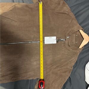 Stylish light brown suede jacket. Features a sleek design with a front zipper. Ideal for versatile wear.