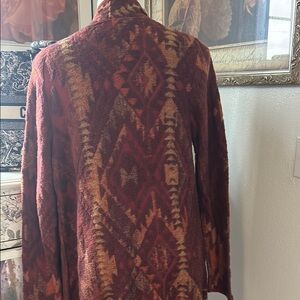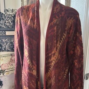 Stylish cardigan with fringe detail. Warm red and brown tones. Perfect for layering.