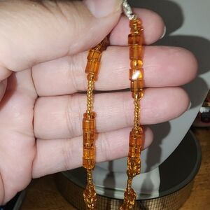 This stunning amber colored glass beaded necklace with glass pendant is perfect for adding a touch of elegance to any outfit. The rich brown and gold tones create a warm, sophisticated look.