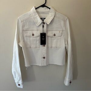 Frye Women's Cropped Raw-Hem Denim Jacket in White with bronze stitching and hardware. New with tags.