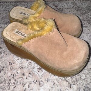 SODA VTG Y2K Brown Faux Leather Chunky Platform Fur Lined Mules Clogs Shoes 8.5