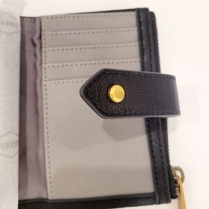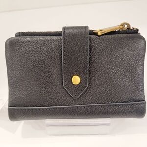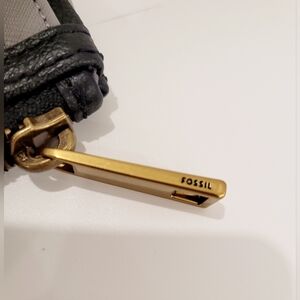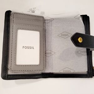 Sleek black leather wallet by Fossil. Features elegant gold zipper and logo.