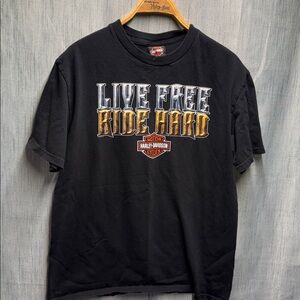 Bold Harley-Davidson logo on a black tee. Short sleeves for casual comfort. Ideal for everyday wear.