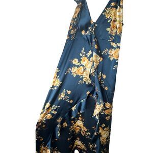 The VICI maxi dress in size large features a multicolor floral pattern and is crafted from satin polyester. It has a long length with a sleeveless design and a round neckline, making it suitable for spring occasions. The dress includes elegant accents like ruffles and an asymmetrical hem, with a pullover closure for easy wear. Ideal for party or cocktail events, this dress embodies an elegant and sophisticated theme. It requires hand washing for garment care. The dress is pre-owned.