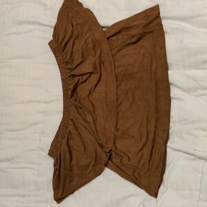 Emory Park made in L.os Angeles faux suede 2 tier top size Medium. It is buttery soft and could be a scoop neck or off the shoulder because the neckline is elastic. it has a lot of great stretch even in the body but pit to pit measures 17 in and shoulder two waist measures 16 inches