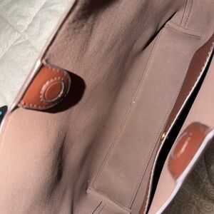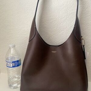 Sophisticated dark brown leather tote by Coach. Features a minimalist design with a single strap.