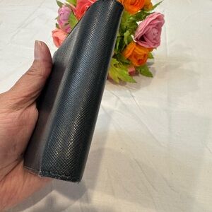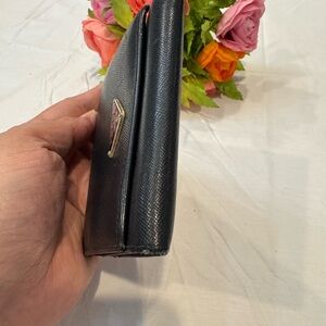 Elegant Prada wallet. Sleek black design. Iconic logo detail.