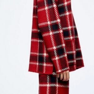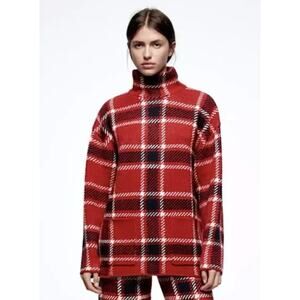 ZARA red black plaid sweater funnel neck with front pockets. Small