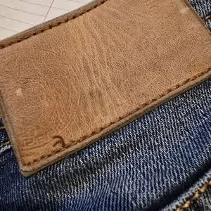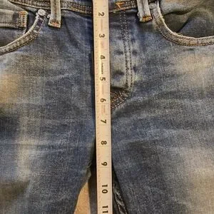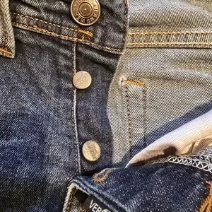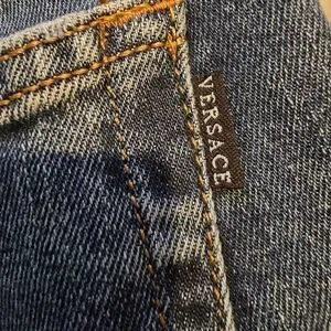 Women's vintage versace, blue denim.Wash jeans with versace label on front fly and back.Pocket leather label on waist is worn, but you can still slightly see the versace logo.These are a low rise straight leg three button fly with the medusa head logo on the label