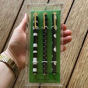 Brand new! Elevate your writing experience with this Kate Spade NY Black Ink Fine Tip Pen Set. The set includes a stylish acrylic tray and 3 pens with dots, apples, and stripes design. The tray is perfect for storing your pens and other writing instruments. The black ink color and fine point type provide a smooth and elegant writing experience, while the gold trim adds a touch of sophistication.
